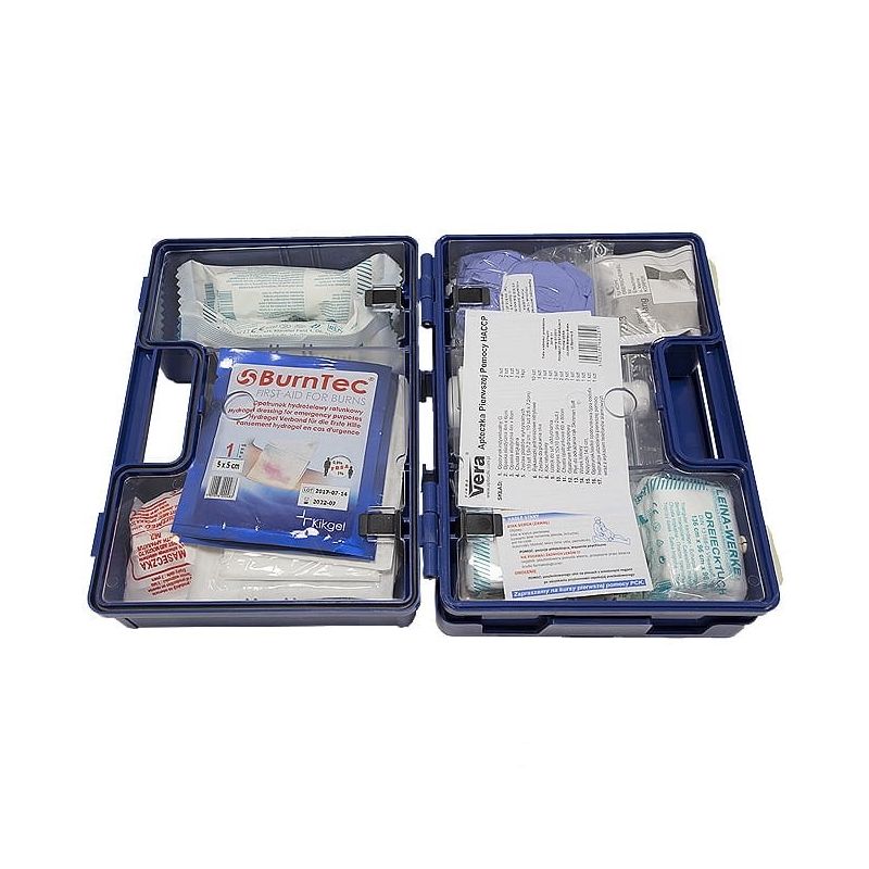 Profesjonalna apteczka pierwszej pomocy HACCP dedykowana dla lokali gastronomicznych i przemysłu spożywczego. Zestaw wyposażony jest m.in. w opatrunki hydrożelowe (na oparzenia), płyn do odkażania rąk oraz specjalne plastry z aluminiowym paskiem pod opatrunkiem, które wykrywane są przez detektory metali oraz na rentgenie (X-ray). Dodatkowo plastry i rękawiczki jednorazowe są w kolorze niebieskim co ułatwia ich wykrycie w żywności. Apteczka posiada również woreczki na leki pracowników.
